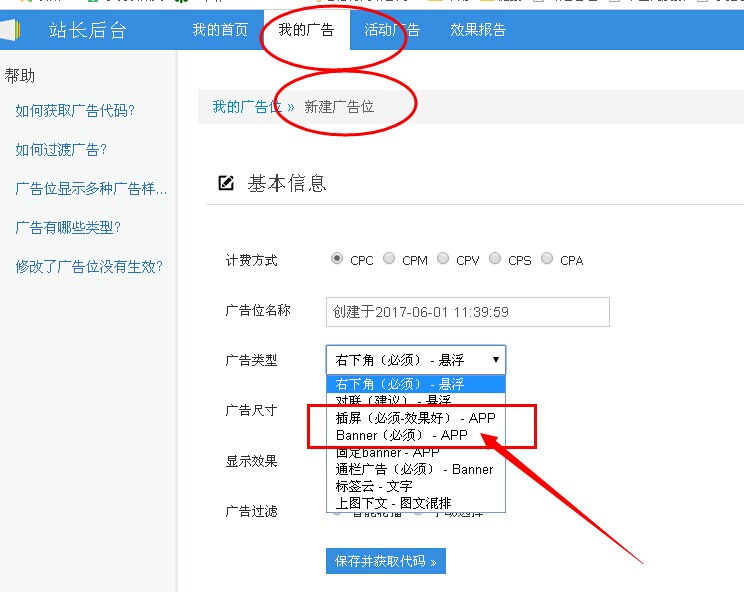 登入会员后台-》我的广告,在广告位列表中可以获取已建立的广告代码,或是新建一个新的广告位。